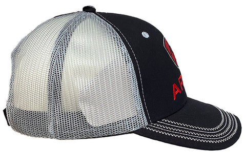 Medium weight washed cotton cap with soft mesh back, embroidered crown, zig zag bill, stitch and a woven label Velcro closure.