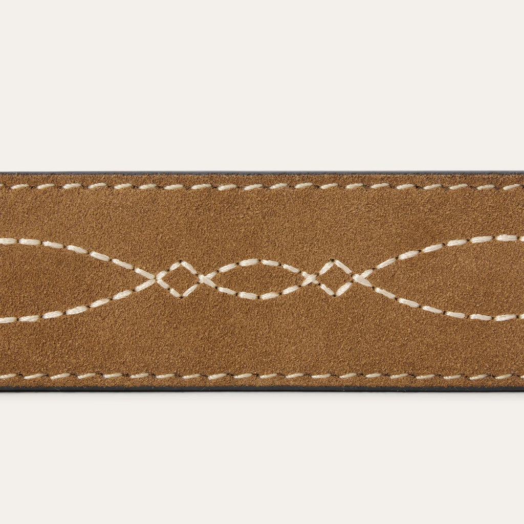 This belt has a 1 ¼” wide sand rough-out leather strap with western stitch detail and tapered 1” tooled, top-grain brown leather tabs. It features five holes on the point end to ensure a proper fit for all body types and is finished with a three-piece silver-tone Stetson buckle set. At once rugged and refined, each of our belts embodies our legendary commitment to quality and attention to detail.