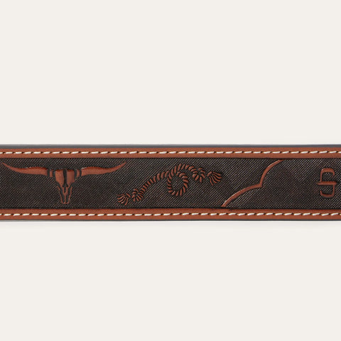 Made from top grain leather, this belt has a 1 ½” wide tooled cognac leather strap embossed with western icons and basket weave tabs. It features seven holes on the point end to ensure a proper fit for all body types and is finished with a silver-tone Stetson buckle. At once rugged and refined, each of our belts embodies our legendary commitment to quality and attention to detail.