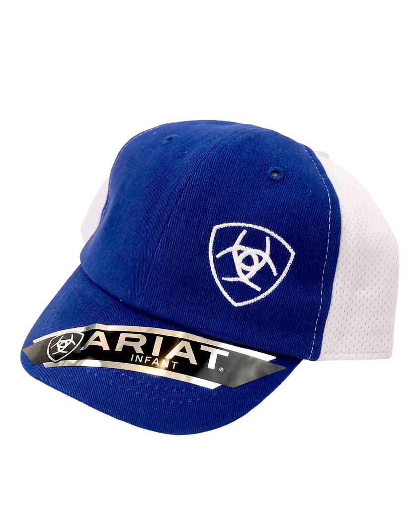 Your little one will be so cute in this Ariat infant cap. The cap has a blue front and bill with white embroidered Ariat shield logo and a white back. Scrunchie back.