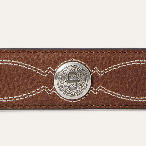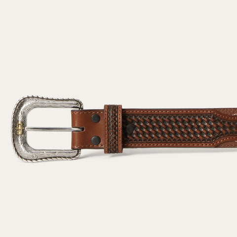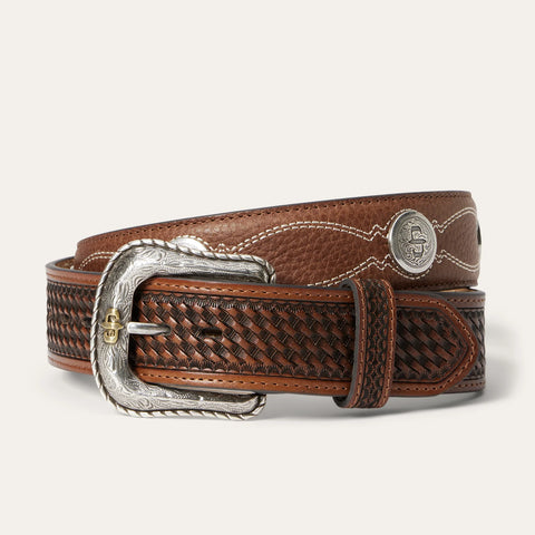 Made from top grain pebble leather, this belt has a 1 ½” wide natural leather strap and brown tooled basket weave leather tabs with western stitch detail. It features seven holes on the point end to ensure a proper fit for all body types and is finished with a silver-tone Stetson concho and two-tone Stetson buckle. At once rugged and refined, each of our belts embodies our legendary commitment to quality and attention to detail.