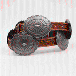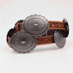 Description This ladies Ariat belt by M&F Western Products has a stylish western look. The tan floral embossed strap is 1” wide. It is accented with large oval floral silver conchos. This belt would look great with your favorite oversized shirt.