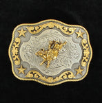 Nocona mens western buckle by M&F Western Products features a silver rectangle shaped buckle with a gold rope edge accented with a motif and floral scroll edges with stars in the corners. Measures: 3-1/8 X 4.